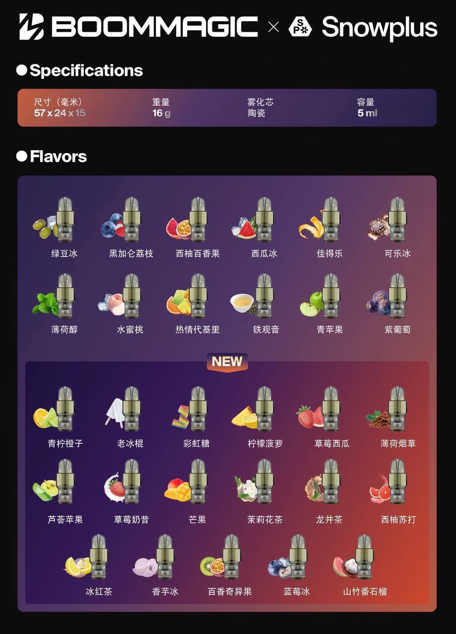 雪加出品,官方宣传1500口,实际注油5毫升,实际口数1250左右。大容量烟弹,适配悦刻五六代杆子,且支持调节功率。但是大容量烟弹后段容易口味变淡。